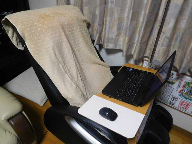| マッサージ機に乗せられるパソコン台 | ソファーの肘掛けに取り付けたテーブル | |