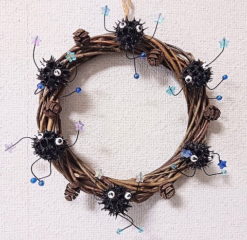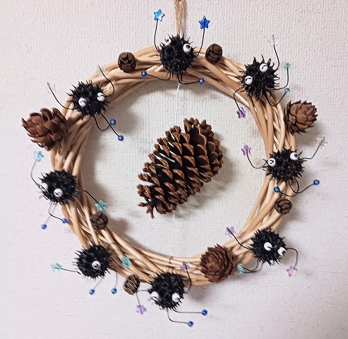 リース・・・「まっくろくろすけ」はモミジバフウの実で作りました。