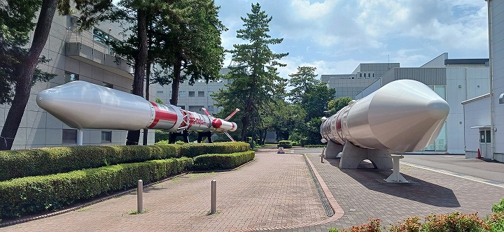 屋外展示の実物大のロケット2機と、宇宙科学探査交流棟内の探査機の模型や