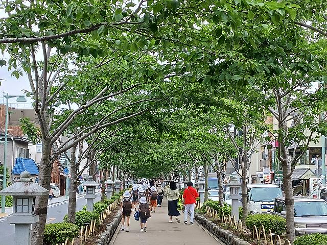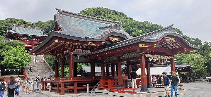 | 参道から見る舞殿(手前)と本宮(後方) |