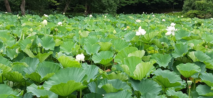 | 参道左側の源平池のハス(白のハスが咲いています。) |