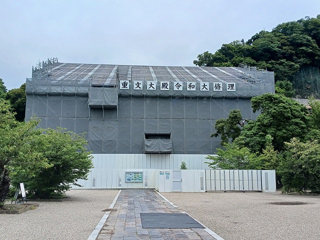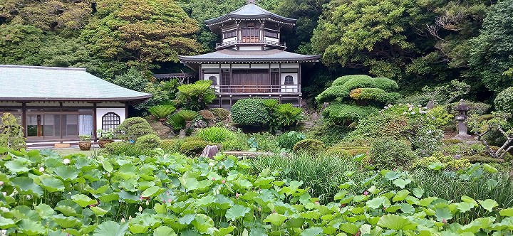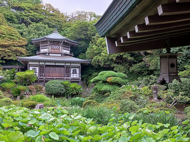 | 書院と大聖閣とハスが咲く記主庭園 |
