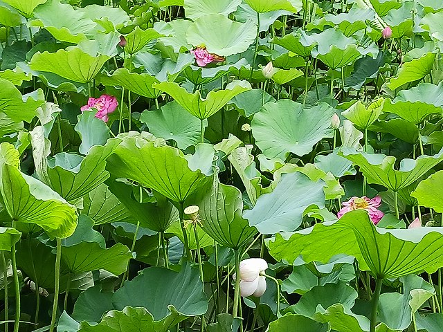 | 参道右側の源平池のハス(ピンクのハスが咲いています。) |