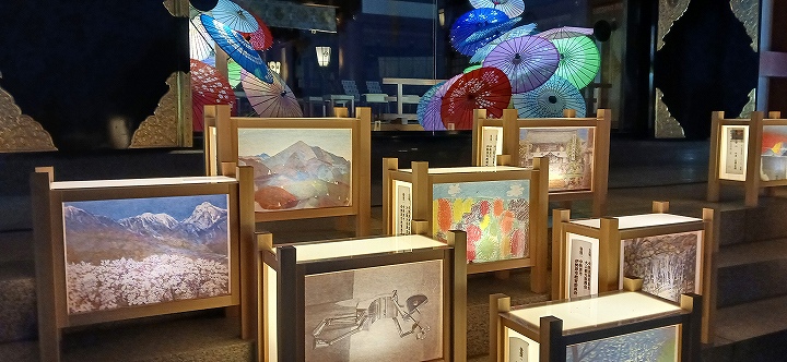 下社の周囲の絵とうろう(伊勢原美術協会 作)