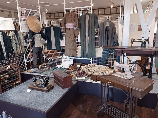 昔の衣類と足踏みミシン