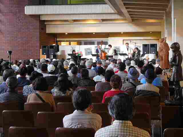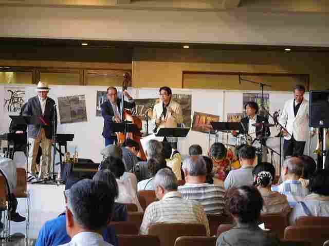 | 秦野市文化会館で行われたジャズコンサートです。ホワイエとは会館の入口と大ホールの 間にあるスペースで、休憩用の椅子などが並べられています。このホワイエに観客用の 椅子が並べられてコンサートが行われました。 |