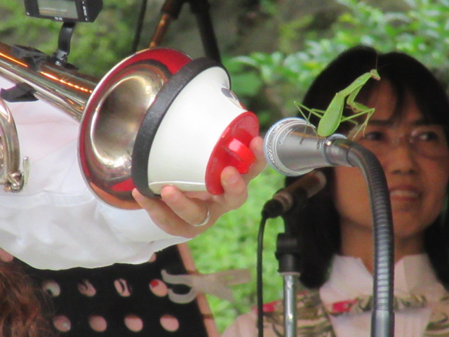 | カマキリがマイクスタンドを登り、マイクに止まり、ソリストのトランペットの先端に止まりました。 |
