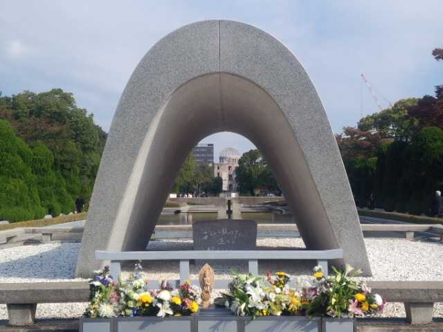 原爆死没者慰霊碑(中央に原爆ドームが見えます。)